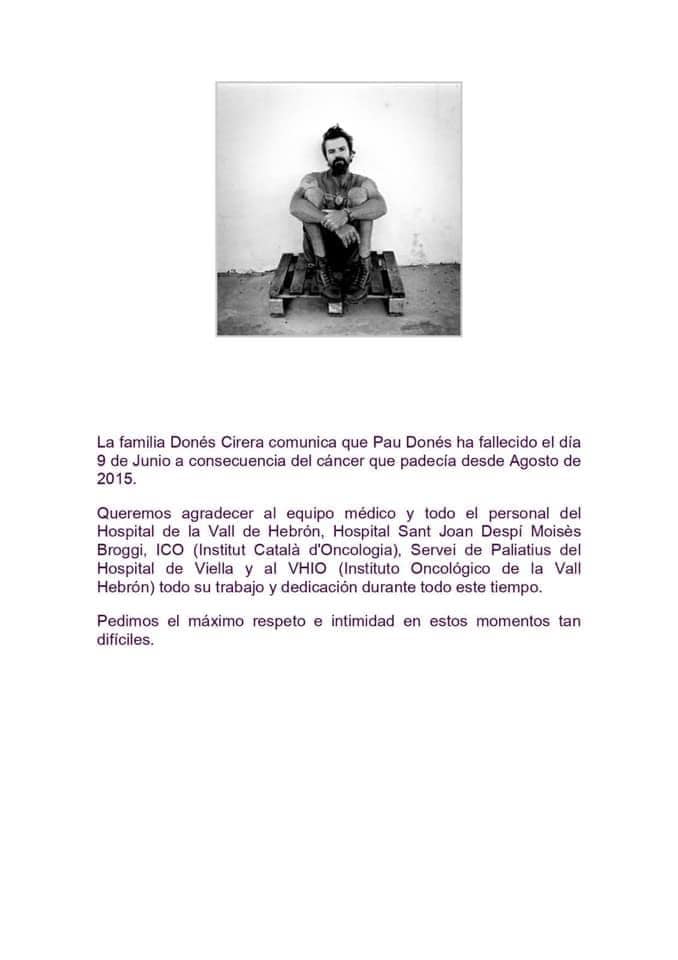 Pau Donés, líder de la banda Jarabe de Palo, nacido en la Clínica de la Sagrada Familia de Barcelona el 11 de octubre de 1966, ha muerto hoy a los 53 años, víctima del cáncer de cólon que le fue diagnosticado hace cinco años. «La familia Donés Cirera comunica que Pau Donés ha fallecido el día 9 de junio de 2020 a consecuencia del cáncer que padecía desde agosto de 2015», dice el mensaje subido a su cuenta oficial de Instagram.