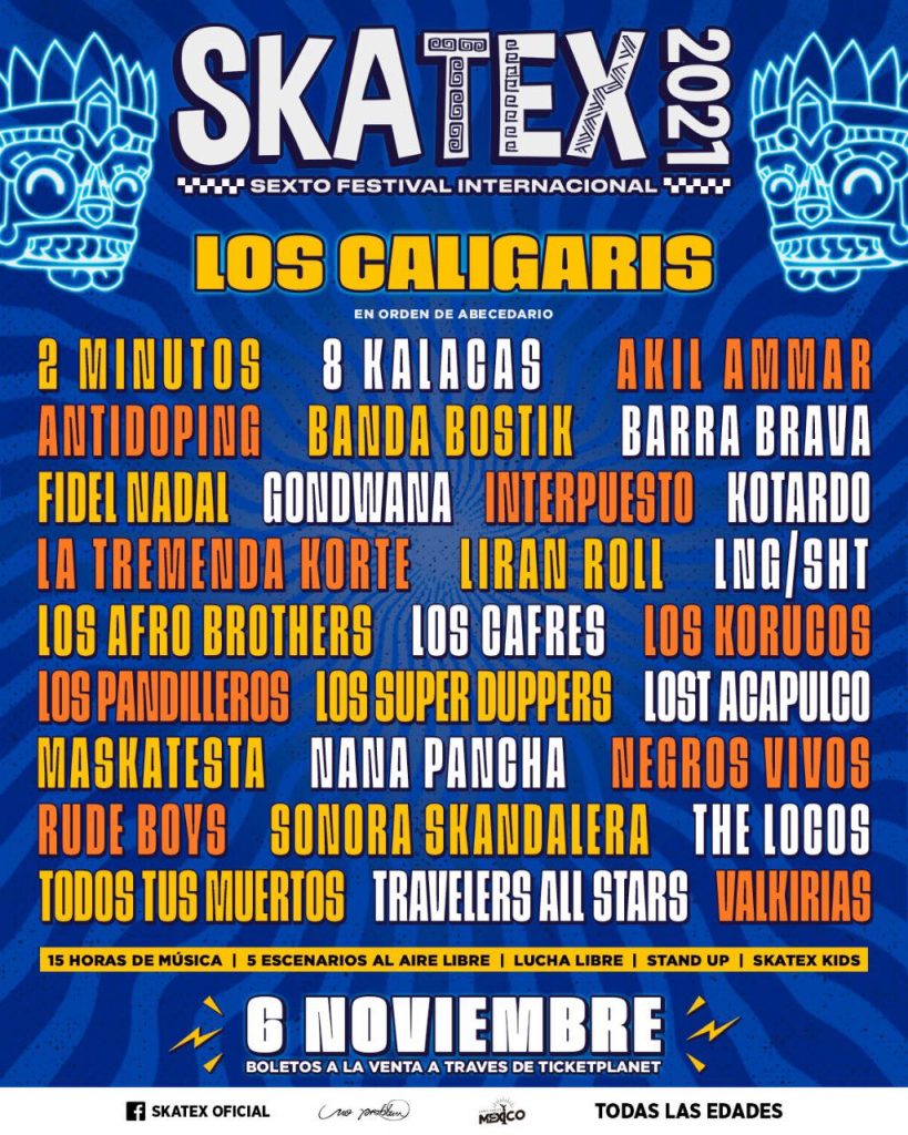 El SKATEX cada año nos va sorprendiendo con su tremendo cartel y para la edición del 2021 no es la excepción, dado que después de un buen rato que nos dejaron esperando con la confirmación de esta nueva edición 2021, todo indica que dicha espera valió la pena al ver que, Los Caligaris, 2 Minutos, Gondwana, The Locos y muchos más serán los encargados de hacer esta gran Fiesta de Ska.