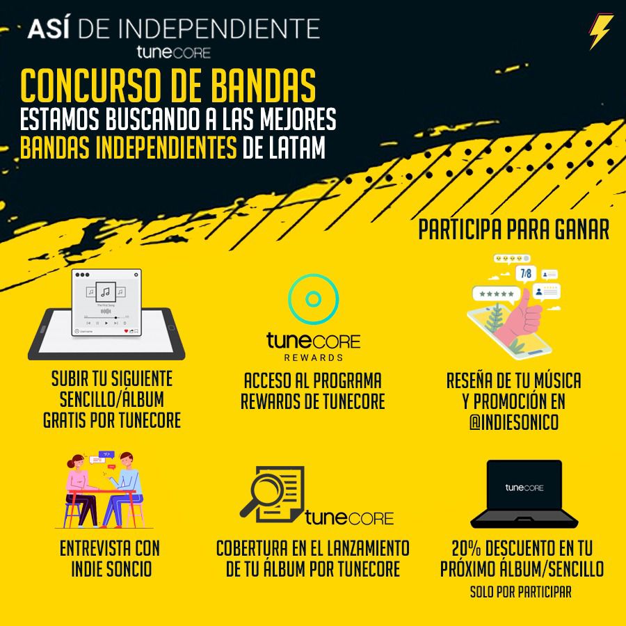 Existirán 6 proyectos ganadores, tres de estos proyectos serán seleccionados por el equipo de TuneCore e Indie Sonico y los otros tres serán escogidos por la comunidad con Dinámicas de interacción lanzadas en redes sociales. La buena noticia es que solo por participar podrás recibir un descuento del 20% al subir tu próximo sencillo o álbum.