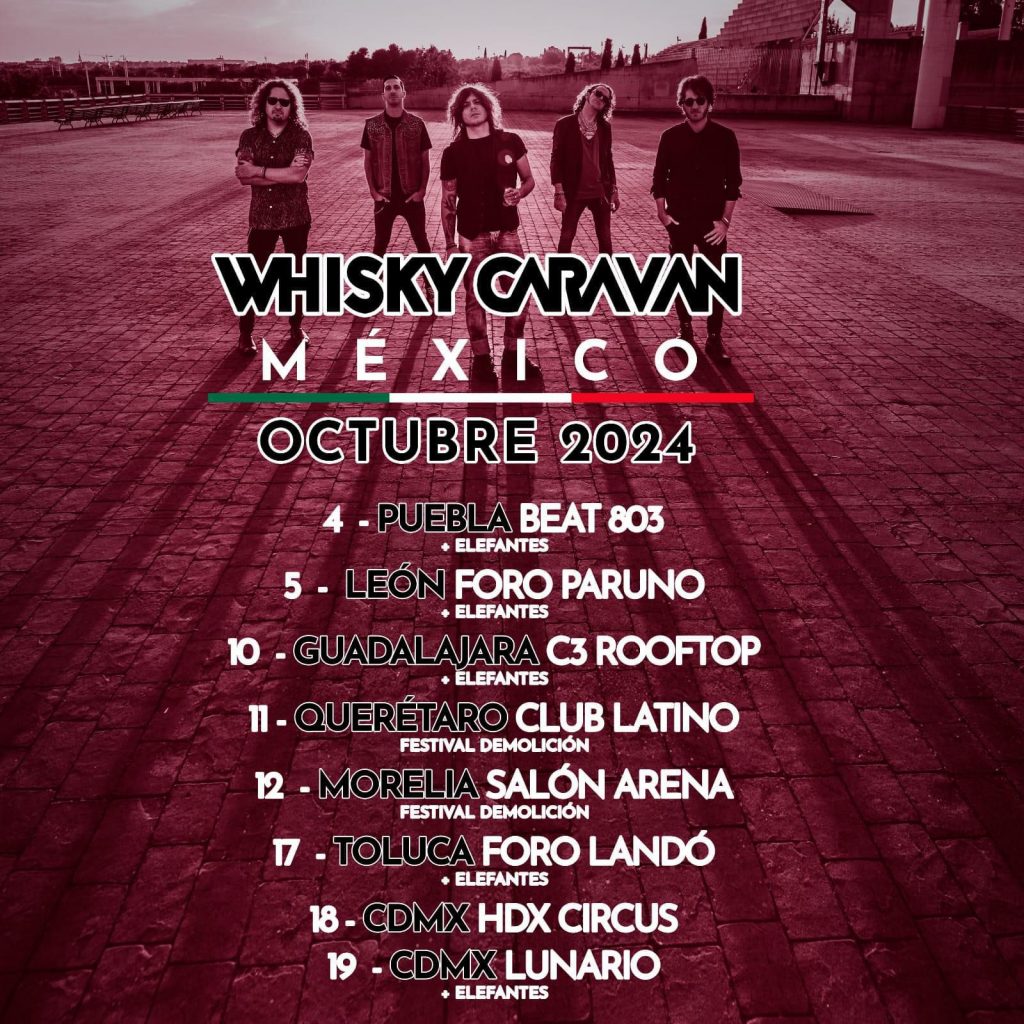 Desde España, Whisky Caravan llega a México para presentar su nuevo disco “Imaginaciones”, un álbum que marca una nueva etapa en la trayectoria de esta banda que se ha convertido en una de las propuestas más prometedoras del rock español. En 2024, Whisky Caravan se une a Elefantes en una gira organizada por Artemisa Music, llevándolos a varios escenarios del país y ofreciendo al público mexicano la oportunidad de disfrutar su potente show en vivo.